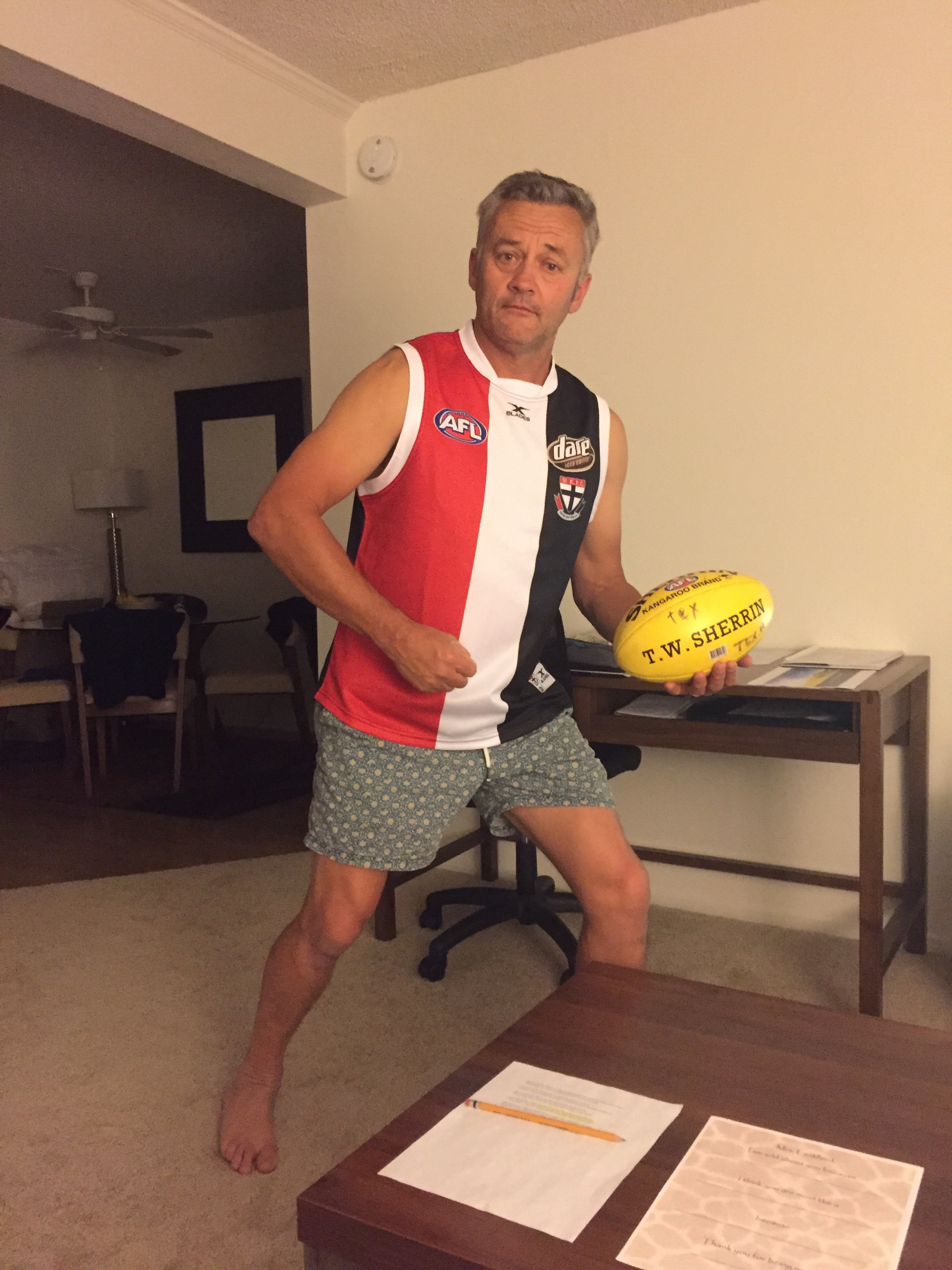 Yep we are Aussies through and through but already change is in the wings. Leroy is throwing a grid iron ball around and he wants a goddam baseball bat already !Tex well he’s always doin what the locals are doin . And soccer is big here and guess what! Holy fuckn sacralidge Leroy is about to join. If he doesn’t do it he’s the odd 1 out I told them the saints smashed the hawks and they just shrugged there shoulders!Fuck now I’m all alone, what am I to do. The only bonus is I l be able to wear my footy jumper without people looking at me like I’m low on IQ (wanted to use other descriptive but better not )Yes I did buy 1 for that very reason. Hmmm can’t bring myself to put it on just yet .