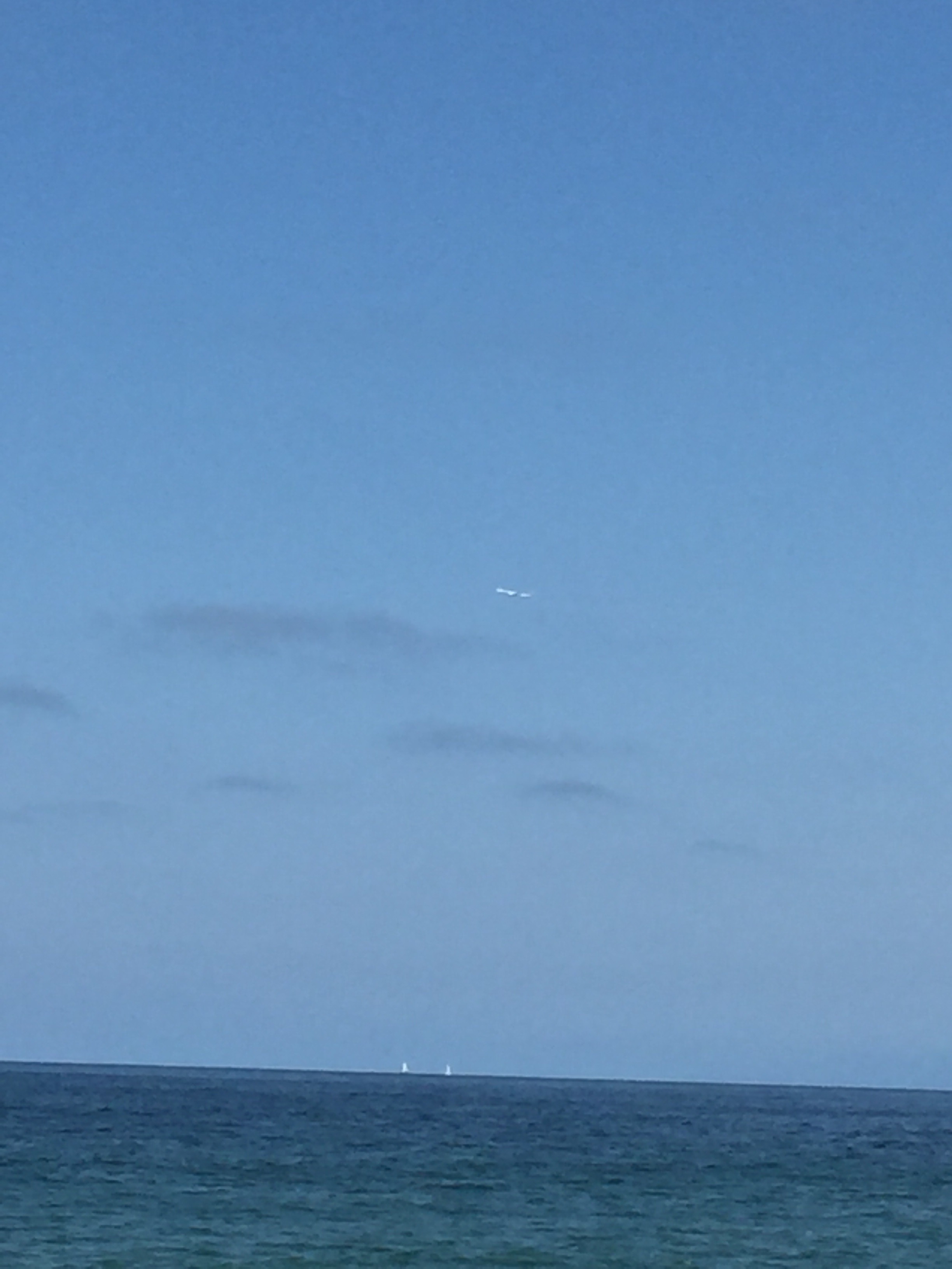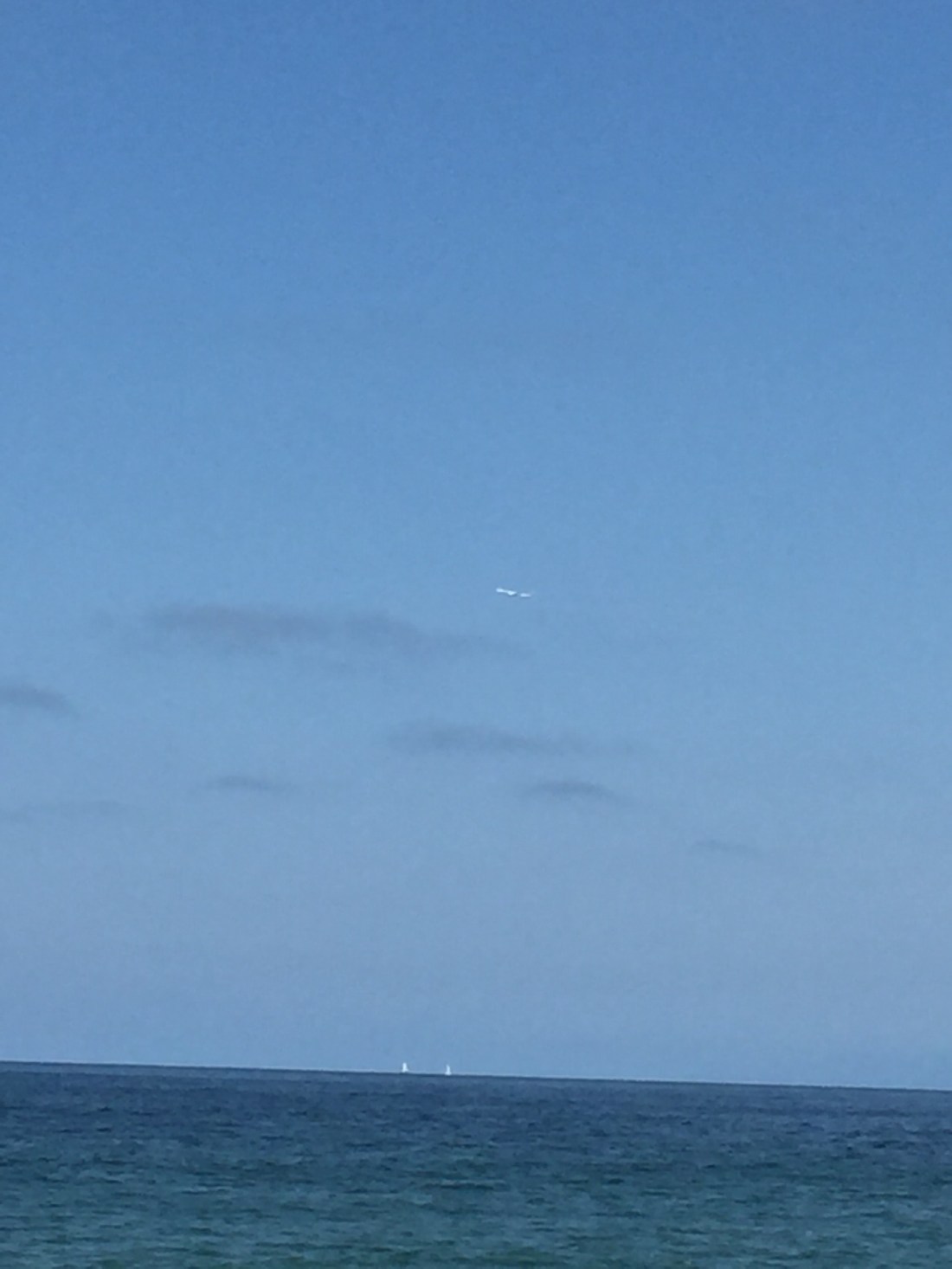 Every morning at 930 this plane flys over head on the Southbay . It’s a Qantas jet , yep this big bird is going home . Surreal , I rarely miss it for I’m in the surf of the Pacific Ocean looking up.You wonder , are there are Aussies doing the same as me ?I took this photo while the kids were playing in the small slappers which crumbled to shore.