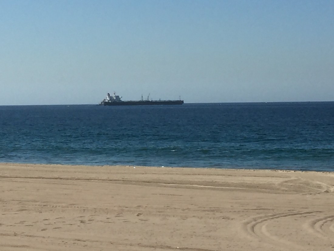 There’s a road that runs along the top , with an old metal fence , barren , rocks and tumble weed . The smog and haze join , its all a grimy yellow .The ships you see in the distance are now massive hulks parked out front , draining their black juice into the Chevron pipeline .
