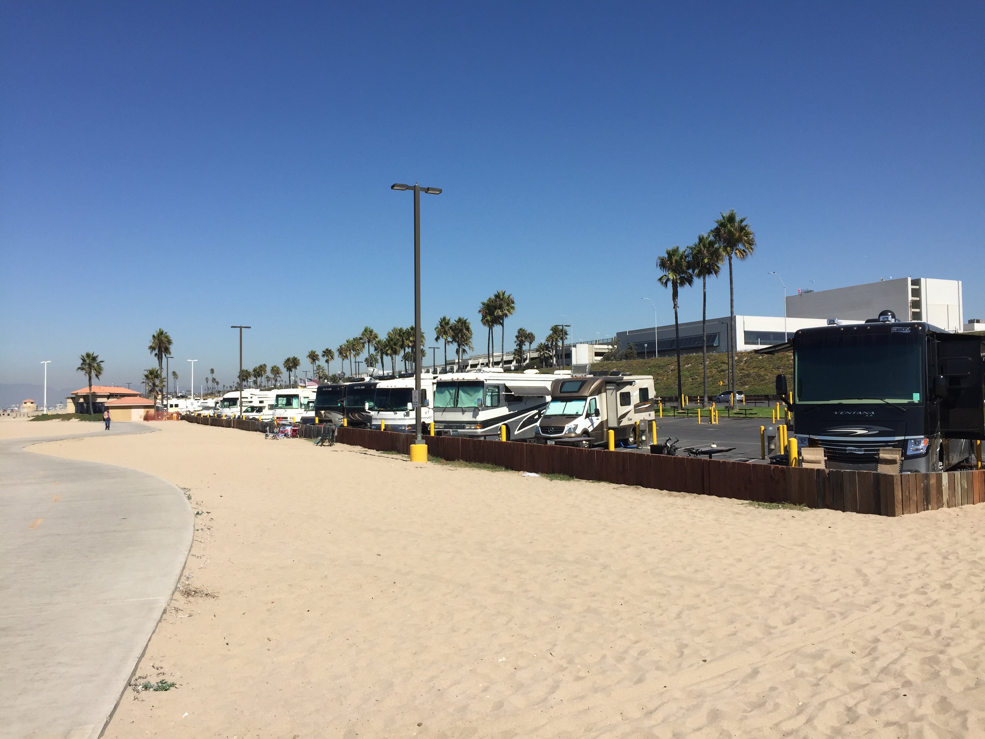 It’s swimmable , not today , not ever but it’d be a mile I reckon. I spotted my 1st bit of reef , the swell catchs it , shit this might be a bit of a spot when the surfs up . Then it becomes apparent , it’s the large oil pipes that run out to the waiting tankers , the waves lick across the top of it , teasing but not breaking . It’s not wide enough . Dockweiller Beach now ,it’s wide , harsh ,a desert on the beach .No one around , concrete pits all over the sand. The pits are for fires . Weekend beach party’s , this must be the location . You’d never see a council set up spaces for open fires at the beach for people to gather in a populated space like this , but this is the land of the free . I can see the breakwater but I can hardly concentrate for there is the constant roaring of jumbos blasting overhead . I’m counting them , 2 a minute are taking off . I told you a lot of people live here , there’s a lot leaving as well .Im nearly at the main water way , there is a large car park full of motor homes .