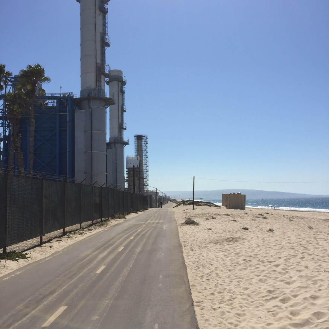 I cruise slow , checking the old boys pick up the slow moving rollers ,sliding down the line on their logs ( mals). It’s quintessential California , beach boys , wiry bronzed old boys with long silver hair and the odd waft of ganja floating across the car park . It’s a slow descent through to Elporto , houses a bit older , weathered but remember this whole stretch is sought after . Nothing under 10 million for this 5 mile frontage. It flattens out now , I’m on my way past the Chevron plant , wire fencing , concrete stacks , rock groynes . Massive ,ugly , it’s a point i havn’t been beyond . Keep going , it’s quiet , the path hits an open stretch of sand , with old concrete blocks painted beige . It isn’t pretty , there’s no beach front housing .