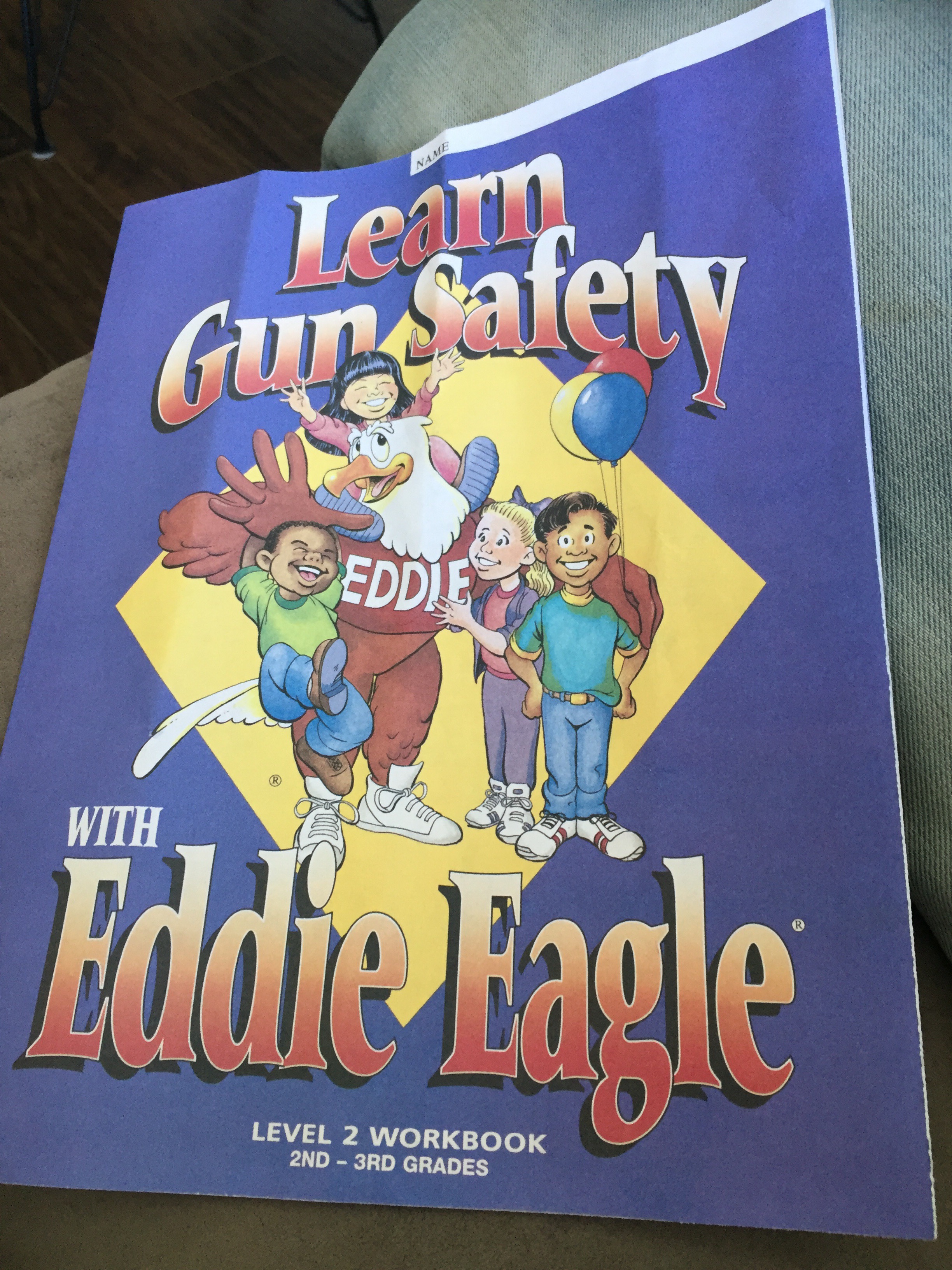 Read it carefully . I always thought Eddie the Eagle was that snow jumper dude that was no good but loved , not some rooster that taught gun awareness . Sacramento ( the capital of California)signed a law last Saturday to prevent school superintendents from allowing their employees ( yes , teachers) from bringing concealed weapons into the class room . 5 districts already allowed this . Of course teachers are made from different DNA stock and don’t suffer from the same afflictions that the rest of us do . A teacher getting angry , real angry , fucked up angry , ever? Until it happens . Why can’t it ?Its just another tragedy on the horizon . Now the poor doctors are being urged to tackle the question . Do you take drugs? Do you eat too much ? How many alcoholic drinks do you have ? …… Have you got guns at home ?….And this is the stupid bit , counsel them on good gun behaviour .Fuck that , why get shot yourself . Soon the doctors are gonna have to carry a glock along side their stethoscope. It’s true , the evolution of gun ownership has unlocked a myriad of educational issues . It’s gone too far , there’s no turning back , there is now unintended consequences . It’s everybody’s problem ; cops , hospitals , teachers and even doctors ………. Am I really living in this place ?