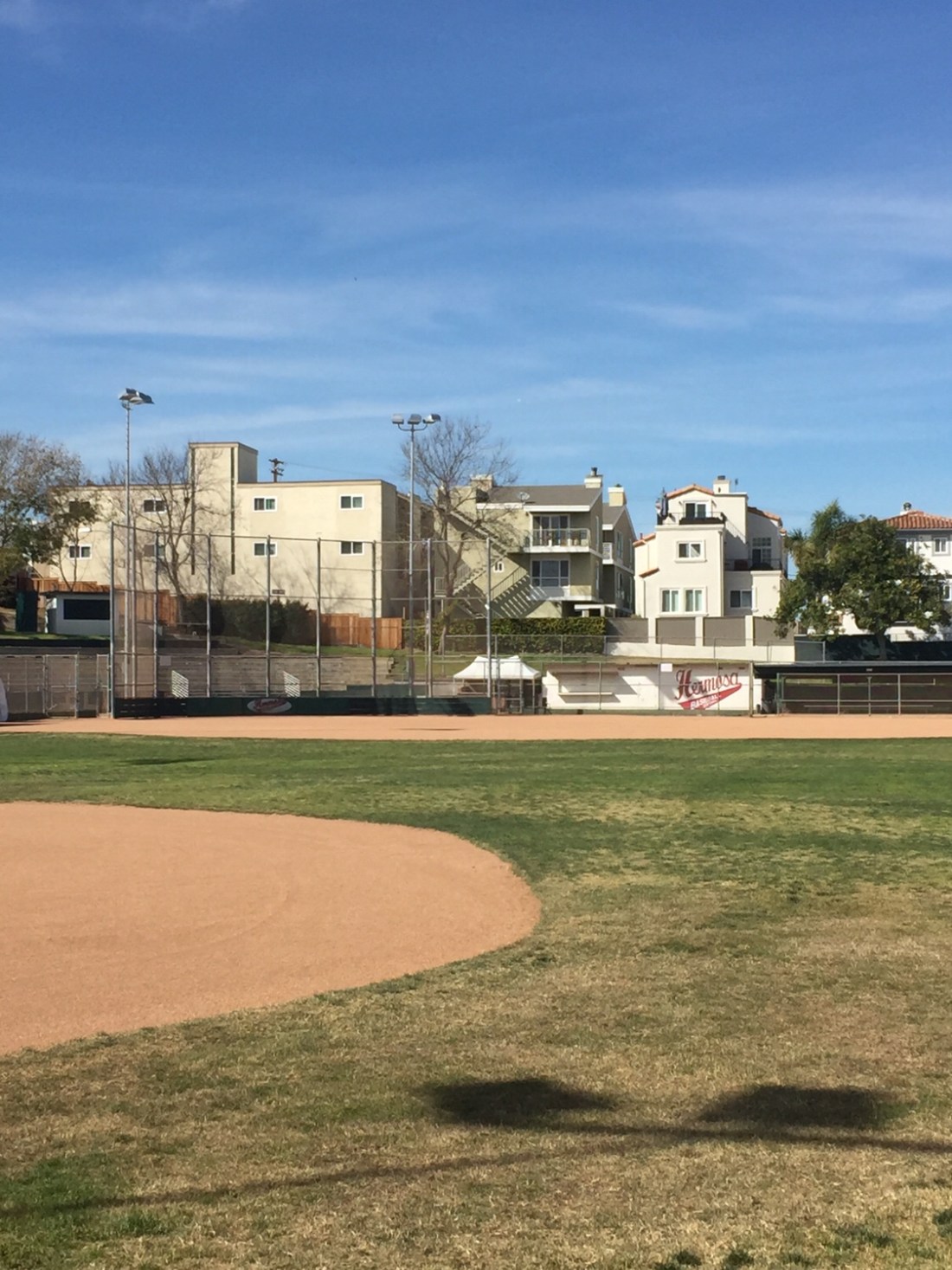 The sandy gravel of the diamond met by perfectly green grass ; hemmed in by fencing and nets , with a complete concrete amphitheater and hotdog stand . We came back on the weekend and the place is humming with kids in uniform , dads in baseball caps and the mums cheering on little Price , Crosby or Nolan ( no Johnny here ) . There’s something more about this place , it’s a symbol of Hermosa Beach , it’s local , it’s there’s . For now we’l look on from the outside .Forward nearly 10 months and we are here , ready for Leroy’s first game . We’d heard rumours that this is where socialising begins . We’ve been through the tryout , as Leroy needed to show what his capabilities were , coming from Australia a place that rarely plays this game . All good there . If anyone knows Leroy you know we’d be well prepared . Plenty of practice out in the park had him champing at the bit . We rock up for opening day and there’s blow up castles , baseball outfits , kids and parents , hotdogs , a brass band .. the works . Emma and I look at each other with a little smirk , shit we’ve underestimated this one