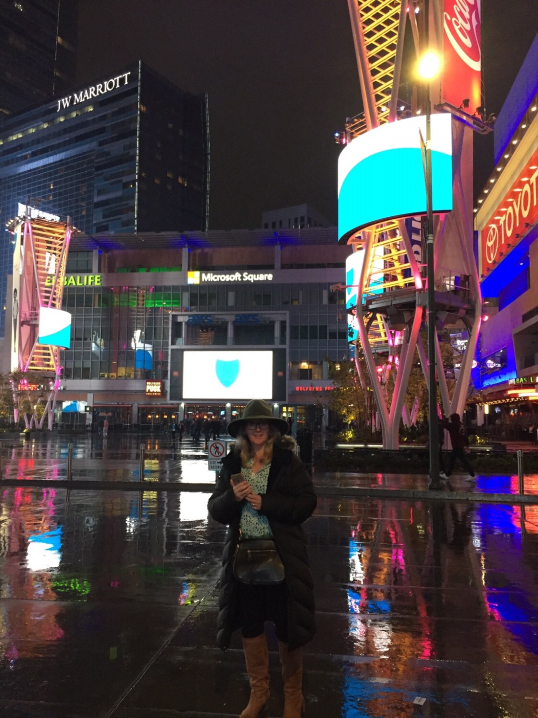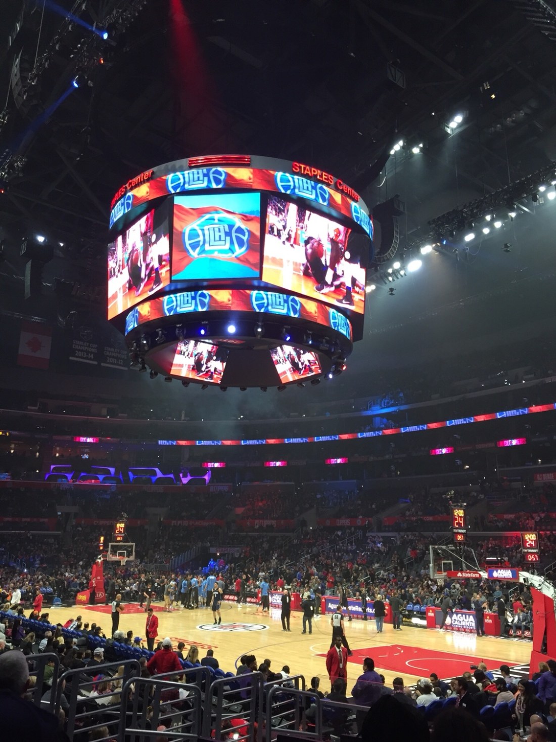 Finally , we’ve decided to tick off one of the ‘must do ‘ experiences of American life , going to a NBA game . Emma booked the tickets online($55 a seat , 15 to 20 meters from courtside ) and then it was just waiting for game day . Of course it had to rain for the 3rd time since we’ve been here , making for a nerve jangling drive into downtown ( 1 hour drive ). Once we get to the Staples Centre it reminds me of Etihad stadium in Melbourne . After dealing with the $30 event parking Emma , Leroy , his mate Carson and myself headed into LA Live .