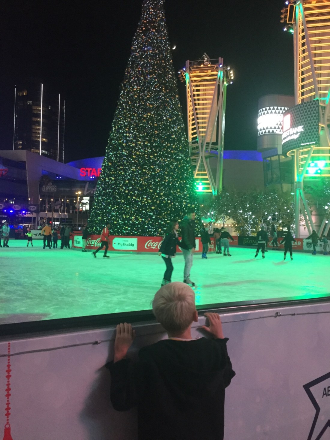 Leroy and I wait as Tim risks life and limb crossing major intersections ,setting up on sweeping bends with no footpath and only two feet of curb between him and oncoming traffic . If these shots come good he certainly earned it . Now it’s the Staples Centre . It has a real docklands type of feel , surrounded by flashing lights and restaurants. In the middle a large Christmas tree and ice rink make it picture perfect.