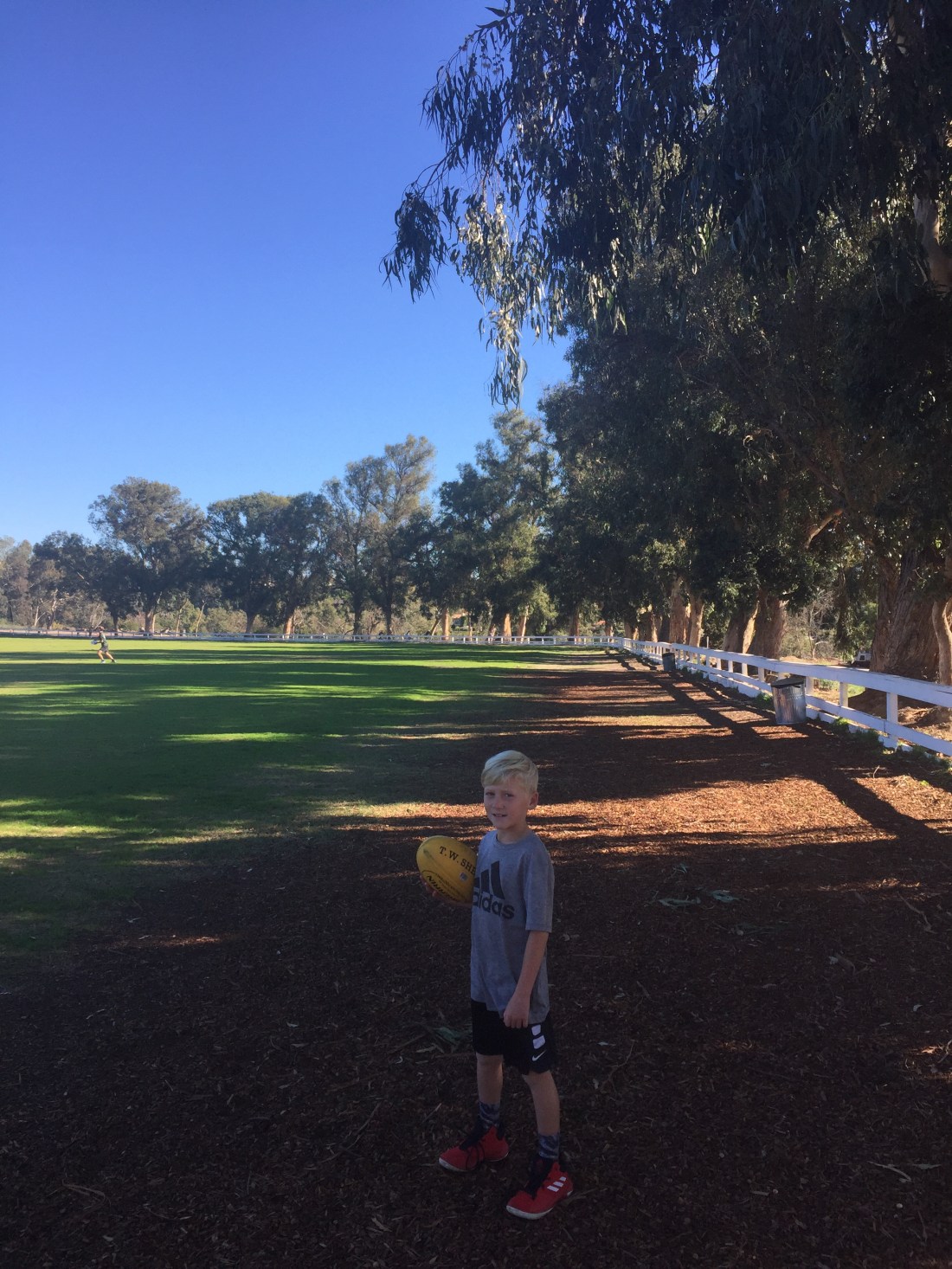 We are here to meet Emmas work mates for a leisurely hike . Luckily I brought our little friend , the Aussie rules footy . On the other side of the gum trees was a fenced off field . “Holy shit , this is made for football .”, I say to Leroy . Shit , I’m already daydreaming of the glory days playing up at the potato chip on RedHill . I’m pep talking Leroy , pretending we are about to run out at our local football ground , through the gum trees , passing the waft of meat pies and VB all the while huddling up as we talk our way up into a frenzy about smashing this other mob . …… “Howie , what are you doing ? We are here to find our friends . We are going for a hike aren’t we ? ” , Emma yells . “Ok , darl ” … that snapped me back to reality . Leroy loves it when I pretend we are about to head down the race to play football .