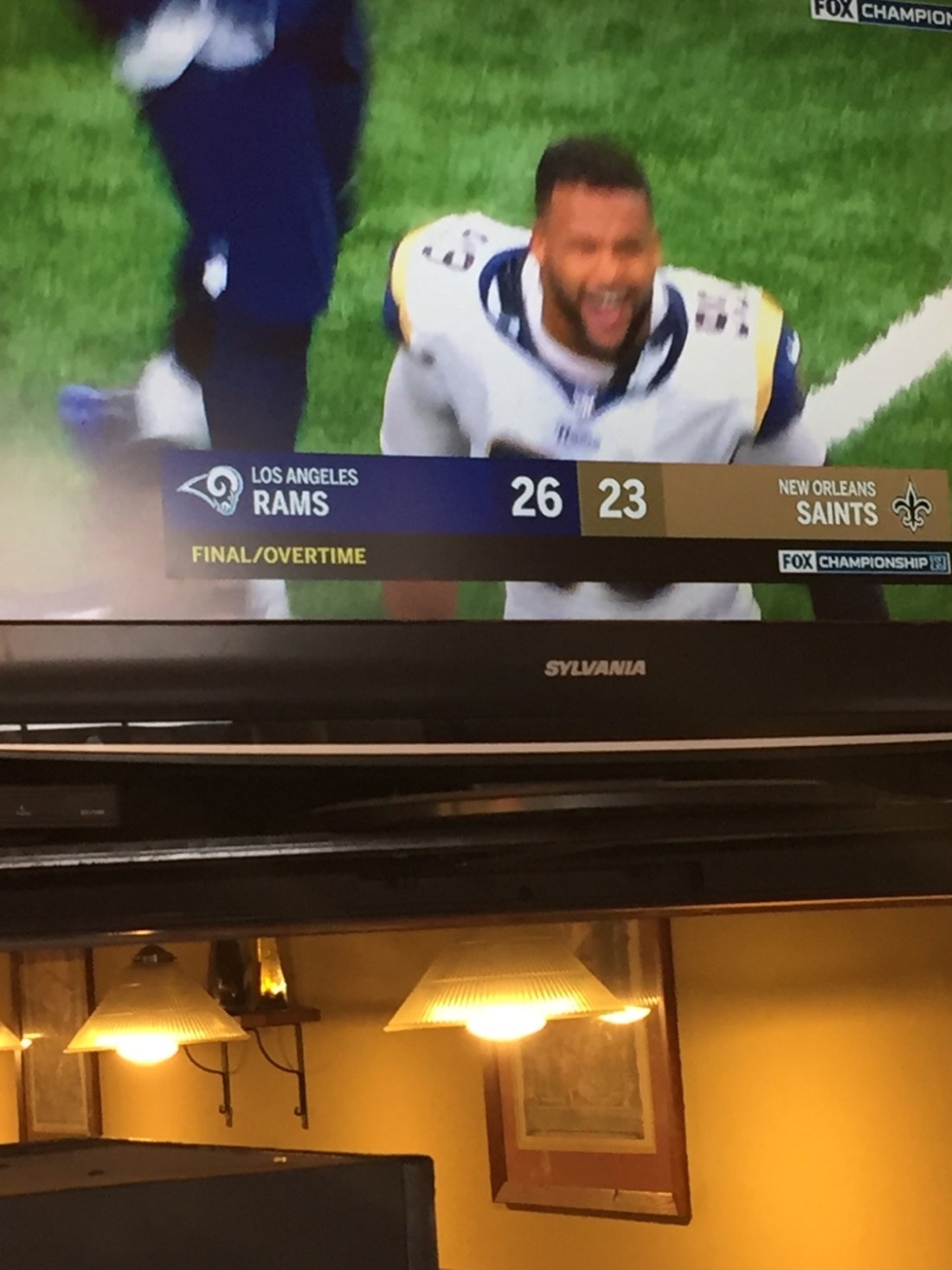 Last week I was at the Northend bar a couple hundred meters from my house , watching the boys get up and win . Today I sat home alone and watched them . Ole mate across the road harassed me about going to the bar but I didn’t want his voice annoying the fuck out of me , and of course he’l have no money and he’l be hungry and … no . Yeah , I tend to get too attached . The worry of losing over powers the optimism of winning . I told you I’m glass half empty . When we had to go to a birthday party with 10 minutes to go , it was a pressure relief . They’re gonna lose ….. but I watch it in the car and when we get to the restaurant it’s on the tv . The other dads are there too . We’re all watching a compelling finish . There’s beer , I get a couple down too . It’s Australian . And then it happens , a win in the very last play to get to the Super Bowl against non other than a team called the Saints . The Saints were robbed too , but this time I dont feel their pain , I’m on the other side . I want to roar out loud , pump my fists and start dancing , but it doesn’t happen this way here . Emotions are contained , the other dads smile and let out a little bit of relief . Did I say there was beer ? … I felt compelled to drain a jug or two ,but maybe it’s not the done thing . Shit , we should be celebrating , but this is LA and a new team with new allegiances . Tribal , it isn’t . The LA RAMS are in the Super Bowl and I told you so .