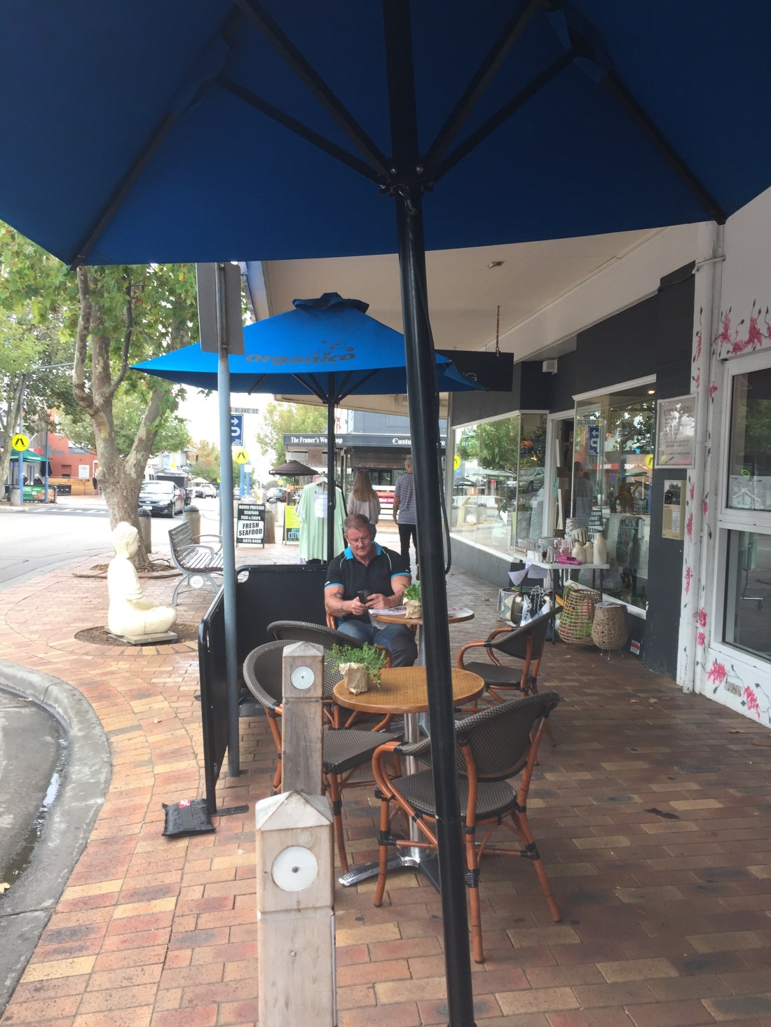 What is it about this picture ? For me there’s a few things , but one stands out most of all . It’s the guy , a tradie , sitting down for a coffee early Friday afternoon . I also know this guy from somewhere , on site or some place in my not too distant past , but I just can’t finger it . I sat there with the kids and longed to be in his shoes , I’d forgotten how often I did this . He’s fit , in his 50’s , taking care of his to do list on his phone . He’s probably set his week up so as he can either kick back on an early Friday arvo or at least take time out for one late weekday job . It’s the whole picture that intrigues me ; the Buddha statue , the fresh seafood sign , the baskets and the framers workshop all in the background. The outdoor seating , the greenery , the quiet . In an hour or so this stretch will be much busier , but not the busy that I’m now accustomed to . He’s got the paper in front of him , probably with the back pages at his starting point so he can check the footy stories .You simply don’t see tradies that look like this guy over here ,and you certainly are not going to see him at a boutique cafe downing a latte or a cappuccino. Living in LA this is a poignant reminder of the class divide here .
