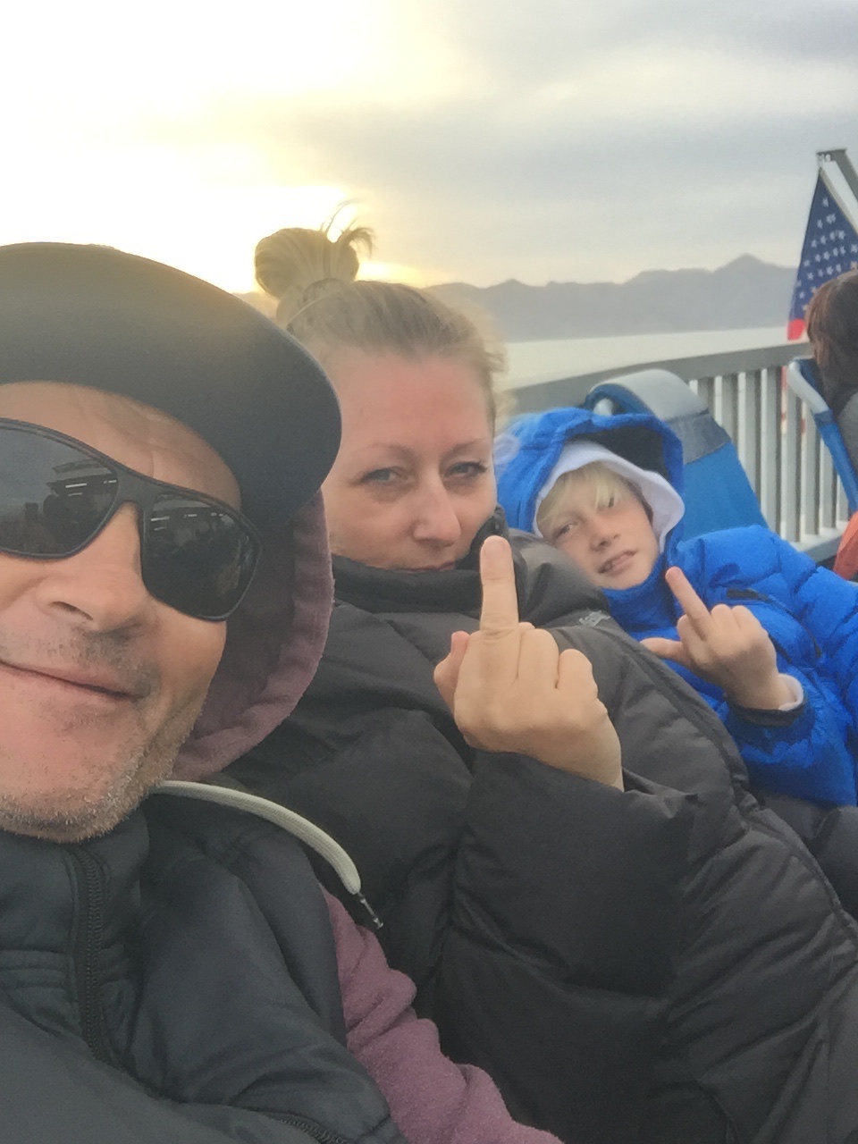 A day and a half later we’re outta there . I sort of accidentally but deliberately rope us into the outside backseat on the ferry . The weather starts to close in but I assure Emma and Leroy that we’ll be right . “It won’t be too cold , she’ll be right bro “………