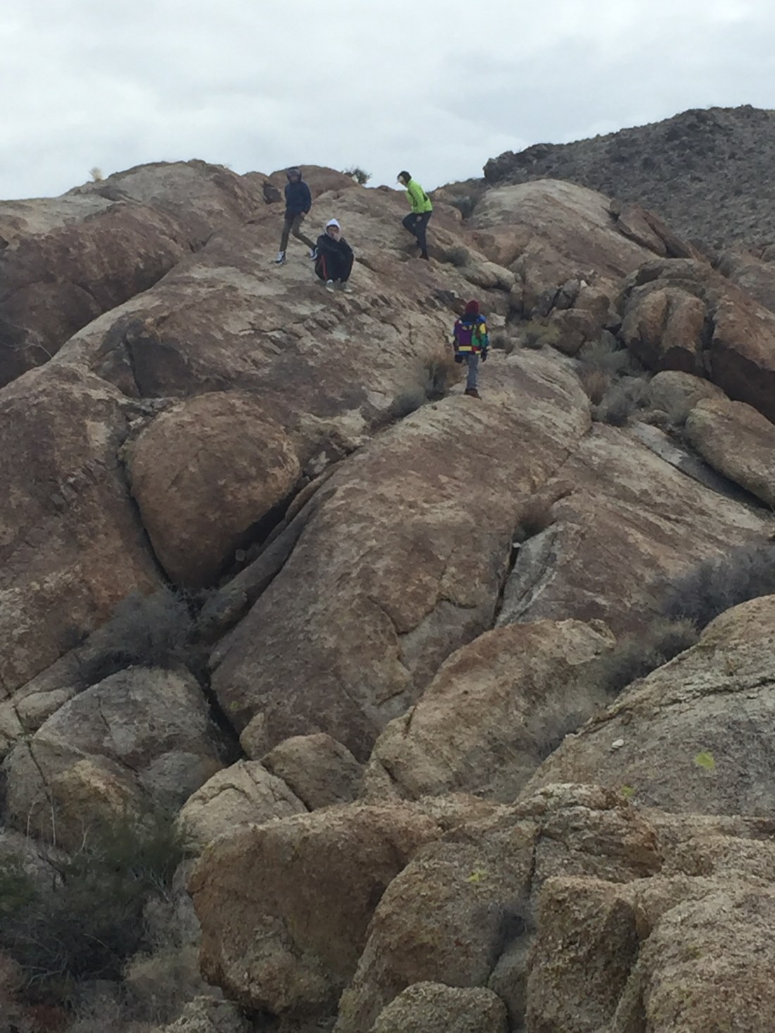 49 Palms …..the violin concerto of complaints and whining led by the kids and directed by Tex was a sight to behold .We drove in unperturbed , the little fuckers are going for a walk no matter what . We’re off , layered up with gloves, jumpers , parkers and beanies . It’s not long before the kids are off up ahead . This part of JoshuaTree is layered with boulders ,rocks ,granite ,small scrub and cacti .