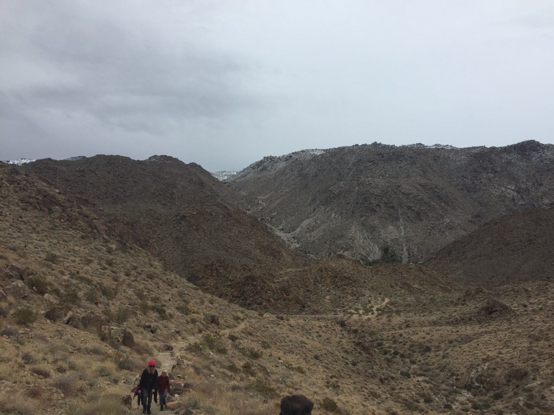 Ahh there it is ,a group of large palms tucked into a fold at the bottom of a ravine ,above it a grandstand of granite covered in snow . There’s no doubting we’ve arrived .Theres “Ois ,Cooees ,mate”are broadcast ,kids arguing ,climbing in areas with signs of ‘no entry ‘to protect sensitive flora and fauna ,all loud enough to be heard by anyone else within a mile of us and of course we flushed out 2 Aussies girls from Melbourne who happened to be also out here .