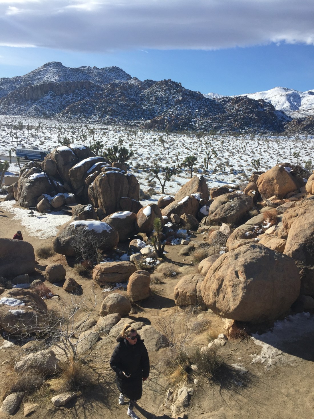 The rocky terrain tinted with a red rust ,gives way to a white winter wonderland . All of a sudden the kids are pleading for us to stop anywhere so as they can get out on the snow . We stop at Quail Springs , a set of boulders opening into a field of Joshua Trees covered in snow . The ranger on duty tells us that we are very fortunate to see the park in its current state . There is a foot+ of snow ,an event that occurs once in 10-30 years . ” You may never see it like this again”, he says