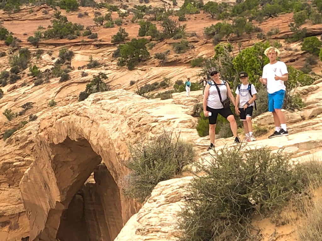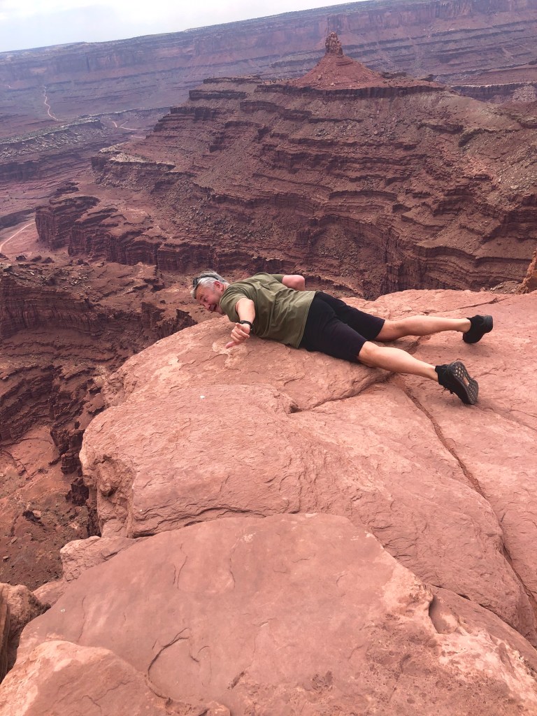 We drive a few miles in and officially enter the Canyonland National Park . This section is known as Islands In the sky . Most spots up here are vantage points to amazing views . The one walk we did do was to Mesa Arch . It wouldn’t be much more than a mile round trip but Mesa Arch is a must walk , even if your kids are whining . Soon as you reach it they’re more than happy to climb over everything and more than happy to throw rocks into the abyss . There are some heart pounding cliff edges to venture up to . I did creep out to a ledge myself . I thought with all my past experiences in construction on high rises and swing work would keep me in good stead , but no . At one stage an almost involuntary stomach drop and need to relieve myself overwhelmed me . Laying down relieved the situation . Ive been to the Grand Canyon , flew over it too but I hesitate to say it but Canyonland has to be close to its equal . Yeah , big statement but I think the accessibility of Canyonland , the sense of vastness and a drop off from most view points that feeds into the horizon gives this place a sense of scale that is dramatic . It’s big up here and it really makes you feel insignificant in the scheme of things .