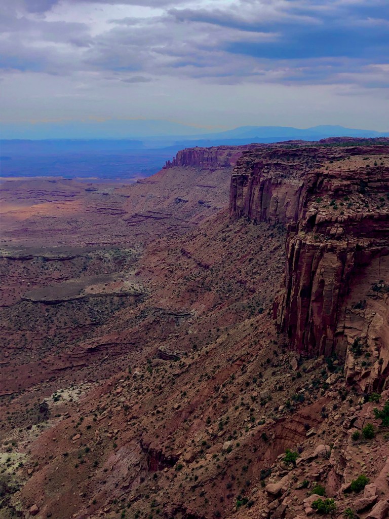 Canyonland is the least revered of the 2 national parks in Moab but certainly shouldn’t be missed . It’s about a 35 minute drive back out of Moab and can easily be done in a few hours with little need to walk too much . The drive to Canyonland slowly sees us climb further . It’s high plains territory We detour into the aptly named Dead Horse point reserve for our 1st drive by look . The trap here is this is a State Park and not a National Park , so our prepaid National Park permit ($80)doesn’t apply . $20 gives us a 3 day pass , it won’t be needed as we’ll be out in an hour , but don’t be dissuaded as the time is well spent .