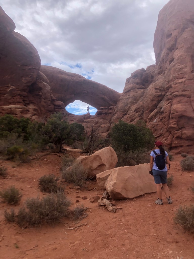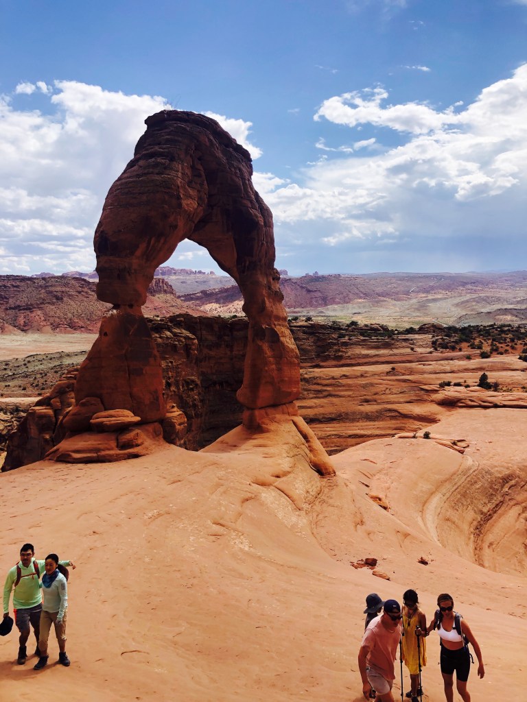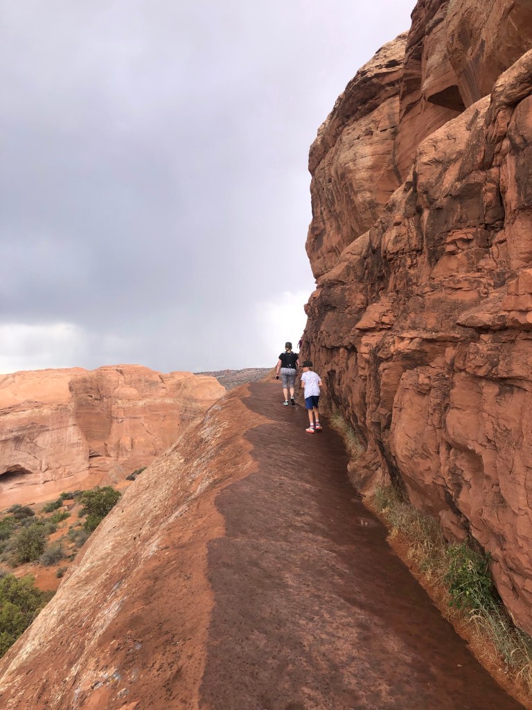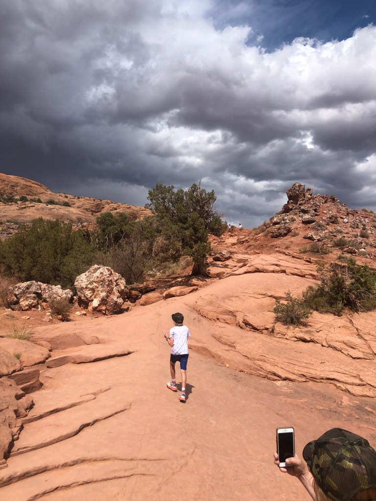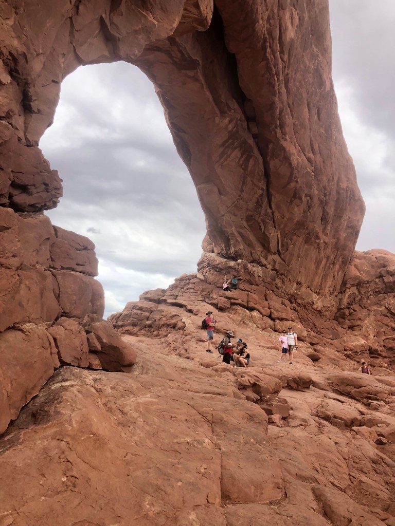 We are not alone . There is still a few people braving the heat and the dark skies to see the jewel of Moab , Delicate Arch . It’s not just hardy travellers, hikers and seasoned backpackers doing these walks . There’s families with young kids , grandparents and even dads with babies strapped to their chests . The walk is strenuous, nothing extreme but the altitude is noticeable. Staying calm , controlling your breathing and not trying too hard to suck in the big breaths is helpful . We see one elderly woman bent over in a nauseous state . There’s not much we can do , she has family at her assistance. Eventually the site of this incredible rock formation is the worth the effort . Delicate Arch ……stunning .
