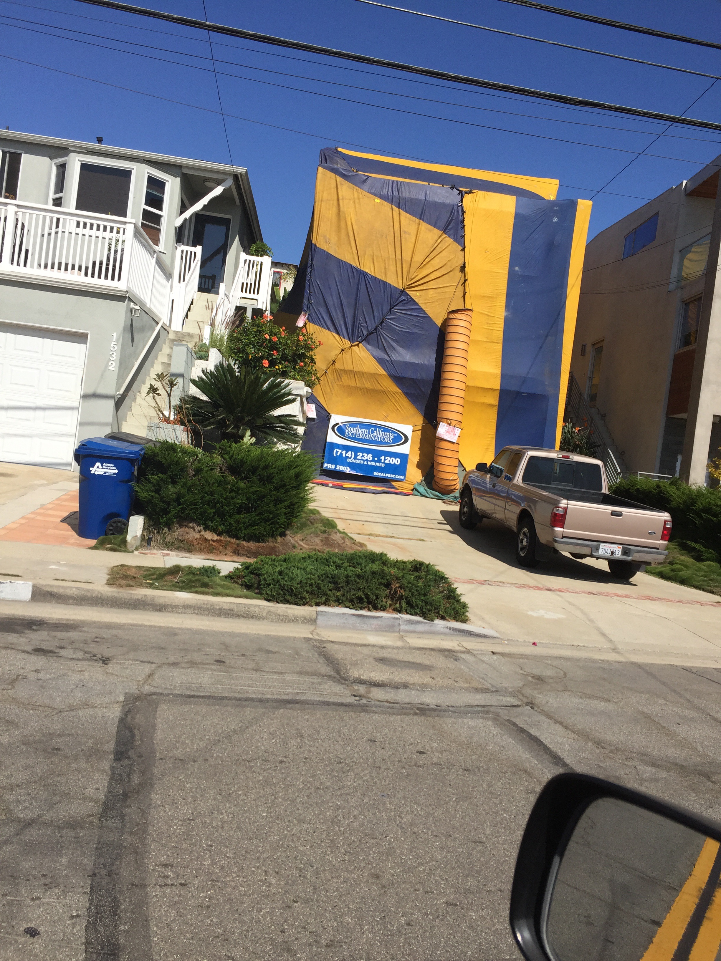 I assumed that it must be asbestos removal . A lot of the houses look as if they’d been built with fibro cement , actually most of them .No I was wrong , its termite control . Termites have the capacity to bring down a large structure , especially when you consider how they build everything in LA.Its not fibro cement ,its timber coated in a trowel on cement . As I’ve said before , there is no brickwork , rarely any weatherboards or any hard structure to the facades of their housing .